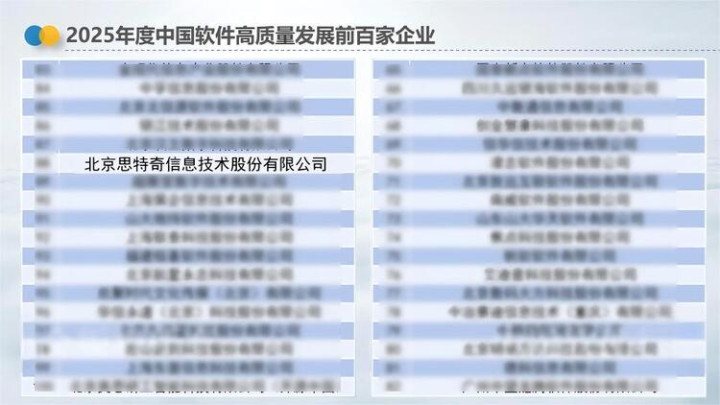 此次入选“2025年中国软件高质量发展前百家企业”,不仅是对思特奇三十年来技术积淀与行业贡献的高度认可,也彰显了公司在“新质生产力”培育与“数字经济”实践中的领先地位。